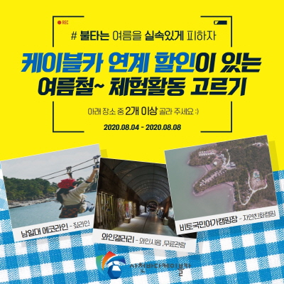 참여방법은 페이스북 또는 인스타그램 공식 계정을 팔로워한 뒤 이벤트 게시물에 케이블카와 연계 할인혜택이 있는 해양레저스포츠 또는 체험관광시설을 선택해 댓글로 남기면 된다.