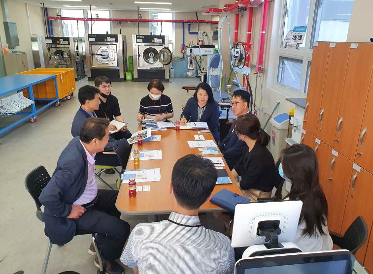 김해 노동자 작업복 세탁소를 벤치마킹 하기 위해 타 지자체에서 현장을 방문하고 있다.