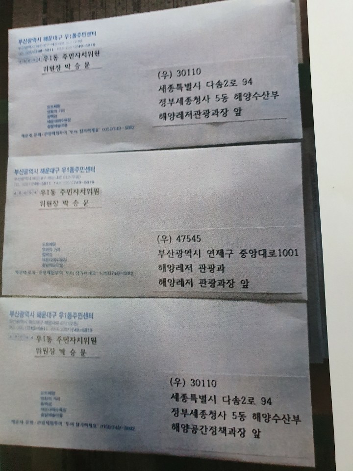 해운대구 우1동 주민자치위원회가 해수부에 전달한 서한 모습.