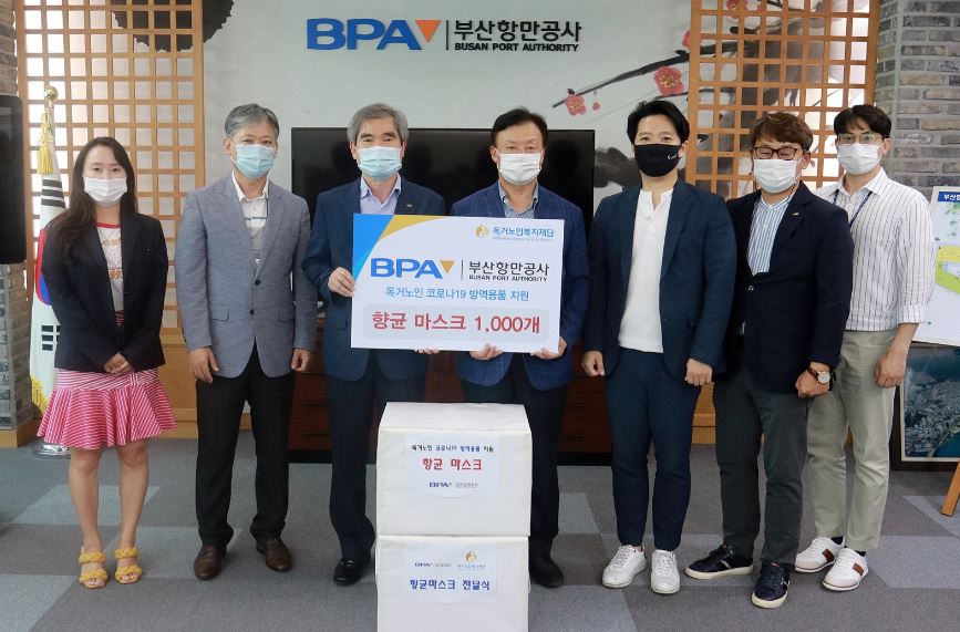 [부산=일요신문] 부산항만공사(BPA, 사장 남기찬)가 경제적 어려움과 혹서기 건강관리에 취약한 지역사회 독거노인을 위해 코로나19 예방 마스크 1,000장을 (사)독거노인복지재단에 전달했다고 지난 18일 밝혔다.