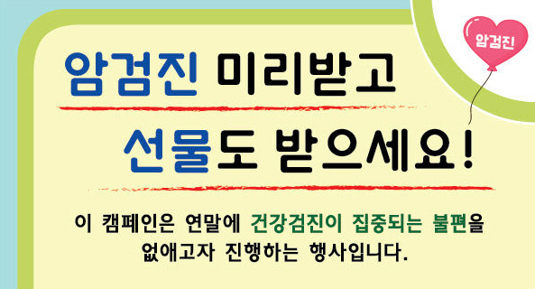 이에 따라 건보공단은 암검진의 중요성에 대한 인식을 높이고 검진의 연말집중 현상을 해소하고자 부산, 울산, 경상남도, 시, 군, 구보건소, 부산, 울산, 경남지역암센터와 공동으로 ‘암검진 미리 받GO 선물도 받GO 건강도 챙기GO’ 캠페인을 확대 진행하면서 암검진 조기 수검을 독려하고 있다.