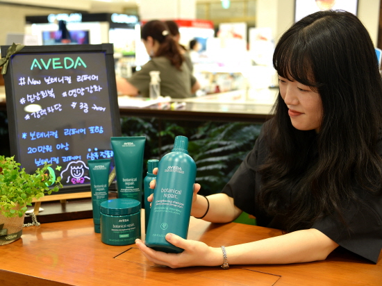 롯데백화점 부산본점 1층 아베다 매장에서는 땀이 많이 나는 시기에 맞춰 샴푸를 선보이고 있다.