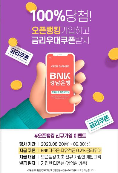 디지털전략부 관계자는 “BNK경남은행 오픈뱅킹서비스에 가입해 다른 은행 계좌 등록과 조회 그리고 이체 등 금융 업무를 편리하게 이용하고 금리우대쿠폰 혜택을 누리기를 바란다. 앞으로도 BNK경남은행모바일뱅킹앱을 이용하는 고객들에게 더 많은 혜택을 드리기 위해 다양한 이벤트와 서비스를 선보이겠다”고 말했다.