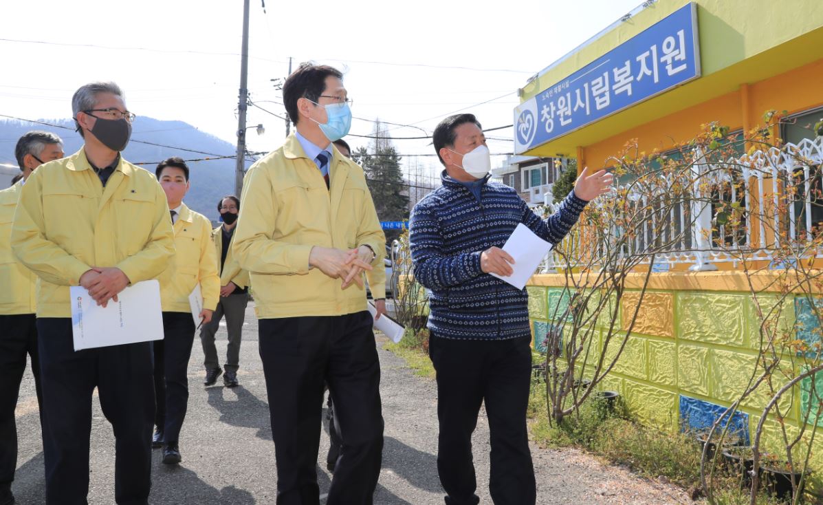 김경수 지사가 3월, 코로나19대응 노숙인시설(창원시립복지원) 현장점검을 하고 있다.