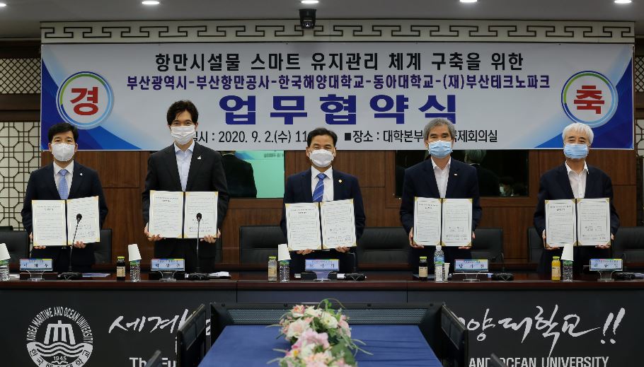항만시설물 스마트 유지관리 체계 구축을 위한 업무협약식 모습. 왼쪽부터 동아대학교 이해우 총장, 부산광역시 박성훈 경제부시장, 한국해양대학교 도덕희 총장, 부산항만공사 남기찬 사장, 부산테크노파크 최종열 원장