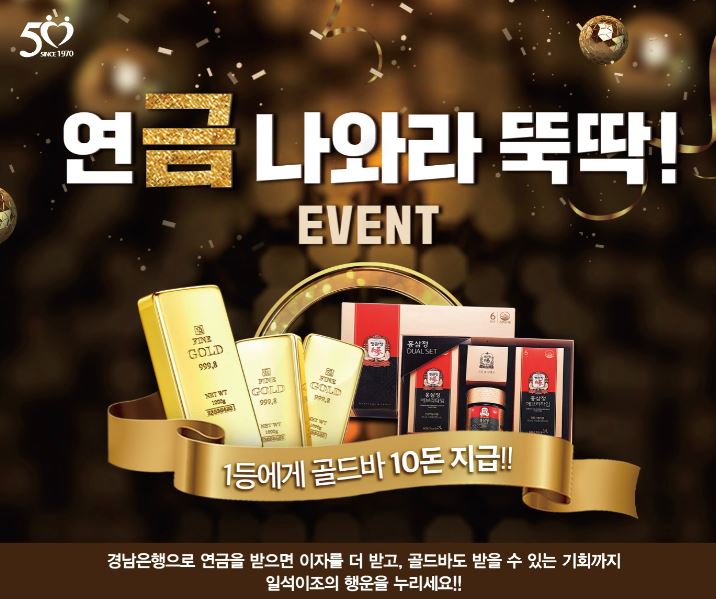 연금(金) 나와라 뚝딱 이벤트 기간 함께100년 연금 패키지 상품에 전부 가입하고 함께100년 연금통장에 연금 실적을 보유한 고객 가운데 16명을 추첨해 1등(1명) 당첨자에게 골드바 10돈, 2등(2명) 당첨자에게 골드바 3돈, 3등(3명) 당첨자에게 골드바 1돈, 건강상(10명) 당첨자에게 홍삼정 듀얼세트를 보내준다.