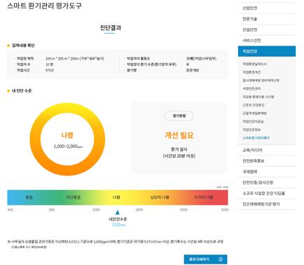 ‘코-숨’은 사업장 스스로 환기상태를 관리하는 도구다. 작업공간의 크기, 작업자 수, 작업시간 등 기본적인 사항을 입력하면 작업장 환기상태에 따른 위험수준과 환기방법을 제시한다.