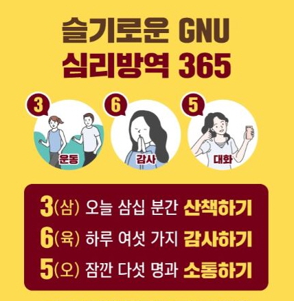 경상대학교 학생상담센터(센터장 김장회 교육학과 교수)는 정신 건강에 필수적이면서도 일상에서 쉽게 실천할 수 있는 세 가지를 선정해 ‘슬기로운 GNU 심리방역 365’ 운동을 전개한다.