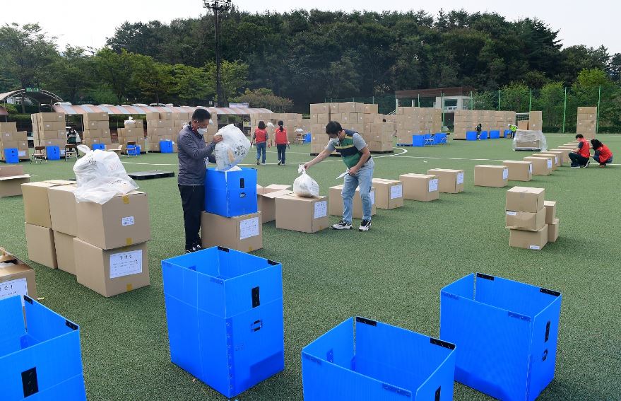 기장군은 9월 10일부터 전 군민 대상으로 마스크 1인당 10매씩 4차 긴급 무상배포, 세대당 1병씩 손소독제 2차 긴급 무상배포를 시작했다. 사진은 9월 10일 오전 9시 30분경 정관읍 소두방공원에서 정관읍 직원들과 이반장 및 자원봉사자들이 마을별로 마스크 수량을 확인하고 주민들에게 배부할 마스크를 수령하고 있다.