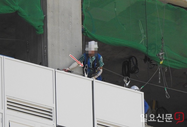 이보다 위험천만한 경우는 고공에서 작업하는 근로자는 안전대 착용이 기본이며 안전줄에 생명줄을 걸고 작업하는 것이 통상적이나 생명줄을 걸지 않고 작업했다. 안전난간을 걷어 놓고 작업하기는 구간도 목격됐다.