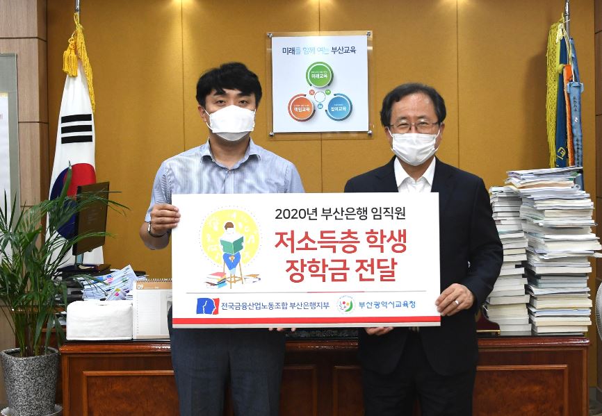 부산은행 노동조합(위원장 권희원)은 16일 오후 부산시교육청에서 지역 저소득층 가정 중고등학생 지원을 위한 기부금 2000만원을 부산시교육청에 전달했다.