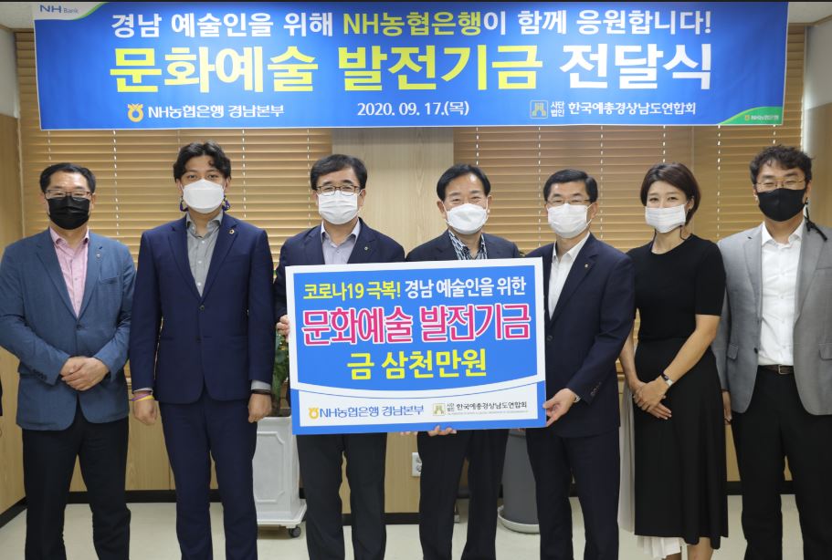 NH농협은행 경남본부(본부장 김한술)는 지난 17일 한국예총 경남연합회(이하 경남예총 / 회장 조보현)에 코로나19 장기화로 큰 어려움에 처한 경남 예술인들을 위한 ‘문화예술 발전기금’ 3천만원을 전달했다.