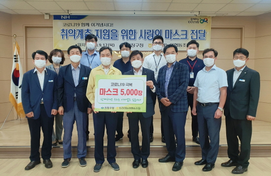 동창원농협(조합장 황성보)은 지난 17일 코로나19 극복에 동참하기 위해 ‘취약계층 지원’을 위한 사랑의 마스크 5000장을 창원시 의창구청(구청장 홍명표)에 전달했다.<사진>