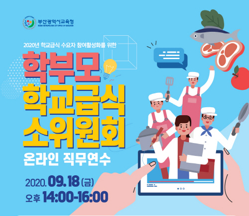부산광역시교육청(교육감 김석준)은 18일 오후 2시부터 1시간 30분 동안 관내 초·중·고·특수학교 학교급식소위원회 학부모위원 1,900여명을 대상으로 ‘학부모 학교급식소위원회 온라인 직무연수’를 실시한다.
