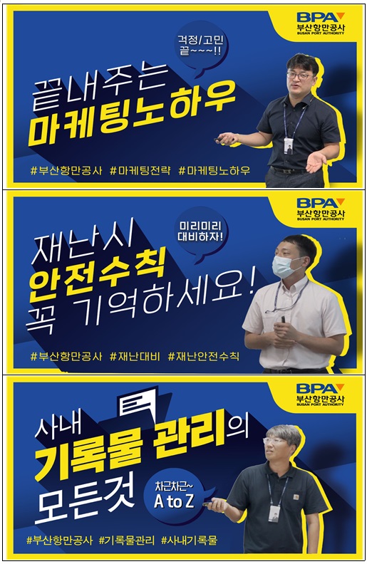 사내강사가 신입직원을 대상으로 교육한 강의영상 ‘부산항 마케팅 전략’을 시작으로 ‘항만 내 안전수칙 꼭 지켜주세요’, ‘공공기관의 기록물 관리 방법’, ‘알기 쉬운 항만법과 공운법 Part Ⅰ, Ⅱ’ 등 영상 총 5개를 자체 제작해 순차적으로 게시한다.