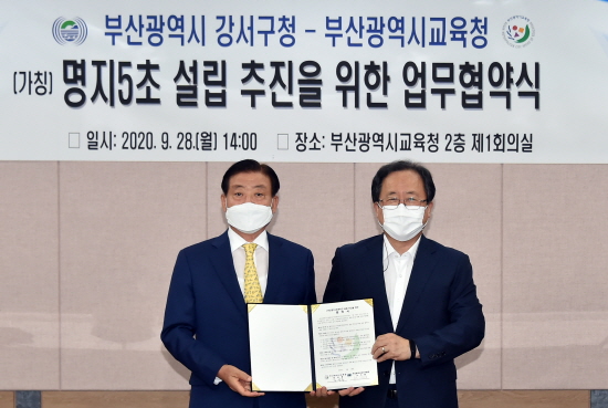 이를 위해 부산시교육청(교육감 김석준)과 강서구청(구청장 노기태)은 이날 오후 시교육청에서 명지5초 설립을 위한 강서구의 30억원 재정 지원을 주요 내용으로 하는 MOU를 체결하고, 명지5초 설립의 차질 없는 추진을 위해 서로 협력키로 했다.