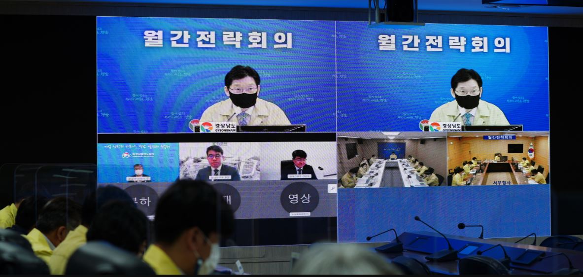이날 회의는 지난 회의와 마찬가지로 코로나19 상황을 고려해 참석인원을 분산한 영상회의로 진행했다. 김 지사를 비롯해 행정․경제부지사와 일부 실․국․본부장은 재난안전대책본부에서, 기획조정실장과 관․단장 등은 영상회의실에서 참여했다. 서부지역본부장과 진주 소재 직속기관장 등은 서부청사 영상회의실을 활용했고, 경남연구원장, 경남테크노파크원장, 경남경제진흥원장, 부산진해 경자자유구역청장 등은 각 사무실에서 영상회의 시스템에 접속했다.
