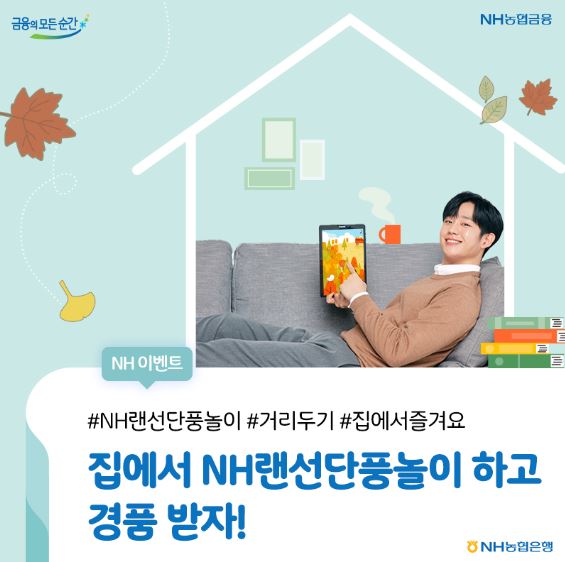 이벤트 기간은 31일까지며, 추첨을 통해 50명에게 집에서 랜선단풍놀이를 즐기면서 먹을 수 있는 우리 농산물, 농협또래오래치킨, 우리농산물, 커피쿠폰 등을 경품으로 제공한다.