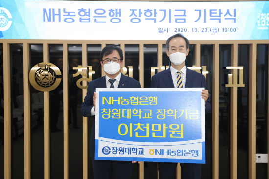 이번 NH농협은행 장학기금은 지난 9월부터 창원대학교에서 진행된 ‘코로나19 극복을 위한 장학금 모금 캠페인’에 동참한 것으로, NH농협은행 경남본부는 코로나19로 경제적 어려움을 겪는 창원대학교 재학생들을 지원하기 위해 창원대학교 주거래은행으로서 기꺼이 힘을 보탰다.