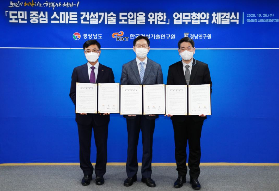 경상남도와 한국건설기술연구원, 경남연구원은 28일 도청 본관 소회의실에서 ‘도민 중심 스마트 건설기술 도입을 위한 업무협약’을 체결했다.
