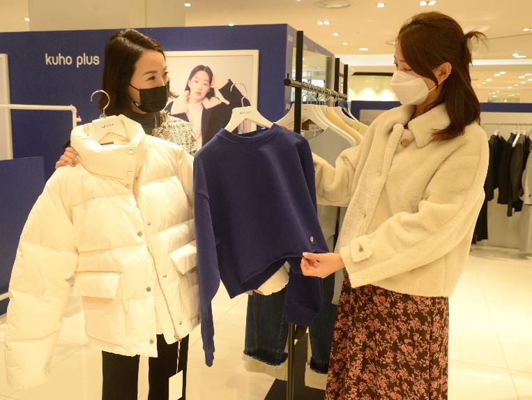롯데백화점 부산본점 2층 구호 플러스 매장에서 여성 고객이 짧은 기장의 숏 패딩과 크롭 티셔츠를 살펴보고 있다.