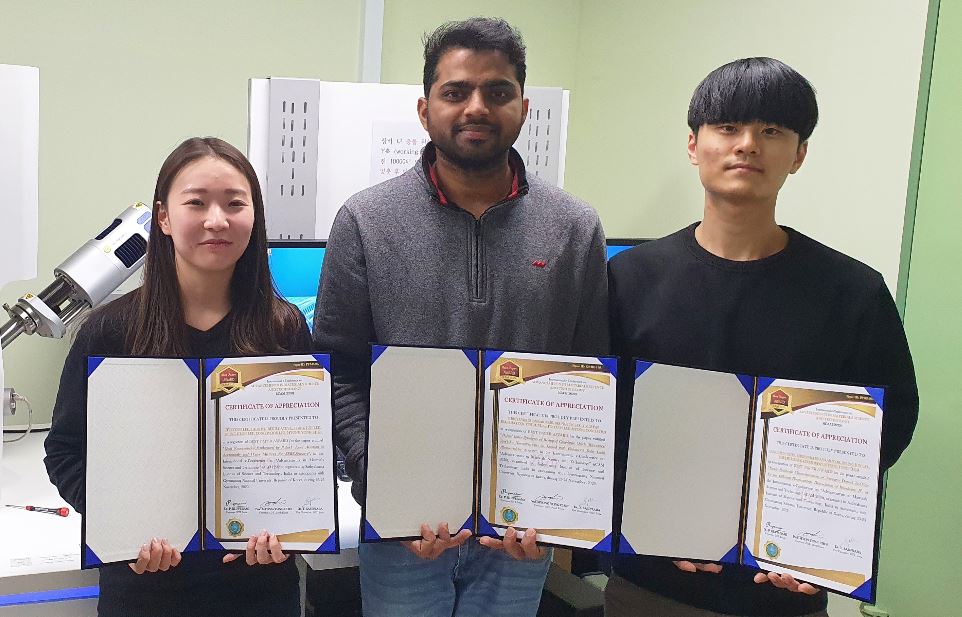 학회 기간 중 경상대학교 화학과에 재학 중인 박사과정 슈레양카 샹카르 나이크 씨는 ‘펄스 레이저 합성으로 제조된 ZnO/Au/rGO 나노구조체의 태양광 광촉매 활성 증가’(Pulsed Laser Synthesis of Reduced Graphene Oxide Supported ZnO/Au Nanostructures in Liquid with Enhanced Solar Light Photocatalytic Activity)라는 주제로 우수 논문상을 수상했으며, 석사과정 이혜연 씨와 연상훈 씨는 우수한 연구 결과를 인정받아 우수 포스터상을 수상했다.