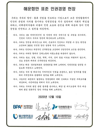 해당 인권경영 헌장은 4개 항만공사가 함께 초안을 작성했며, 지난 11월 18일부터 25일까지 각 항만공사 홈페이지를 통해 실시한 설문조사 결과를 반영하는 등 임직원 및 외부 이해관계자의 의견을 수렴하는 과정을 거쳐 확정됐다.
