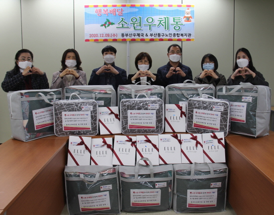 [부산=일요신문] 부산지방우정청 동부산우체국(국장 김을순) 행복나눔 봉사단은 연말을 맞아 지난 9일 부산 동구 노인종합복지관에 설치된 ‘우체국 행복배달 소원우체통’에 저소득층 어르신들이 편지로 신청한 소원 물품을 정성껏 준비해 전달했다.<사진>