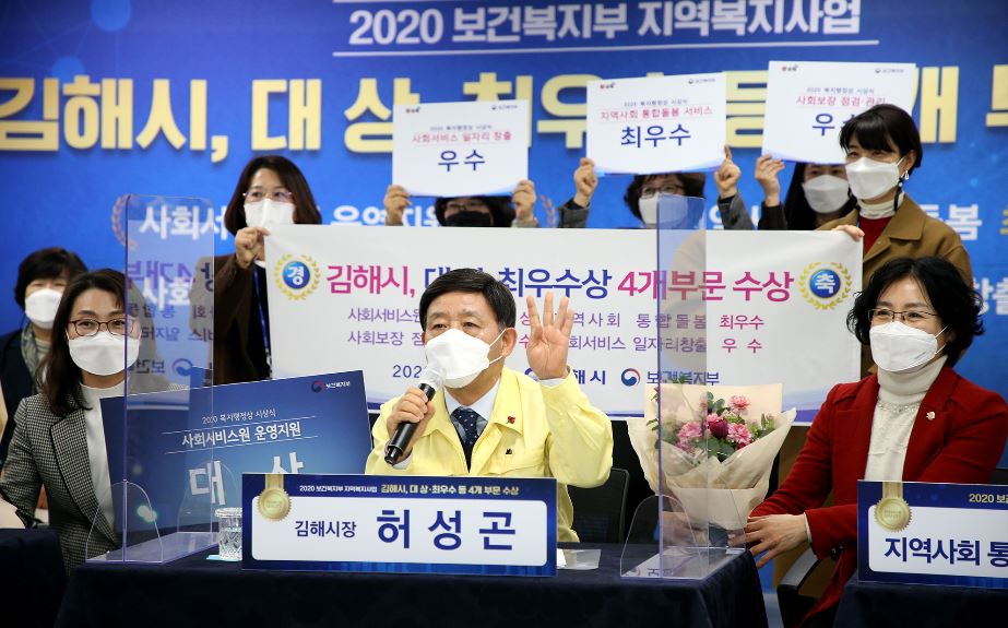 시는 보건복지부가 전국의 지자체를 대상으로 지난 1년간의 업무실적을 평가하는 ‘2020년 지역복지사업 평가’에서 사회서비스원 운영지원 기반구축 및 사업 활성화를 위한 노력으로 사회서비스 운영지원 분야 대상을 수상했으며, 김해형 통합돌봄 추진체계 구축을 통한 주거, 보건·의료, 요양돌봄 등 맞춤형 서비스를 제공하는 지역사회통합돌봄 분야에서 최우수상을 수상했다.