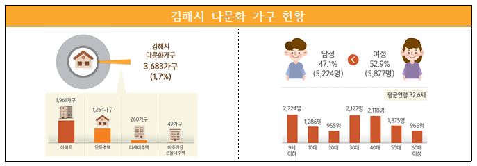 다문화 가구원의 평균연령은 32.6세로 중년기(34.0%)가 가장 높은 비중을 차지했으며, 결혼이민자 및 귀화자 32.3%(3,590명), 한국인 배우자 29.9%(3,321명), 자녀 27.5%(3,055명) 등으로 구성돼 있다.