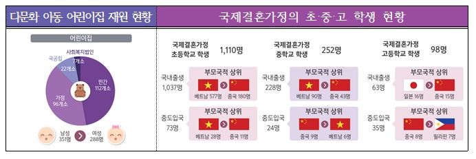 국제결혼가정의 초등학생은 1,110명(국내출생 1,037명, 중도입국 73명), 중학생은 252명(국내출생 228명, 중도입국 24명), 고등학생은 98명(국내출생 63명, 중도입국 35명)으로 2017년 대비 초등학생은 227명(25.7%), 중학생은 118명(88.1%), 고등학생 24명(32.4%) 증가한 것으로 나타났다.