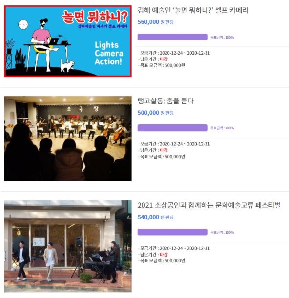 다섯 개 예술 프로젝트팀 모두 성공적으로 펀딩을 마친 만큼, 예술 활동을 이어 갈 수 있게 되었다. ‘레드 콘텐츠’는 김해 문화 기획자와 예술인들의 일상을 담은 영상 콘텐츠를 제작하고, ‘한국문화예술 통’은 김해 부원동에서 ‘해설이 있는 탱고 공연’을 갖는다.