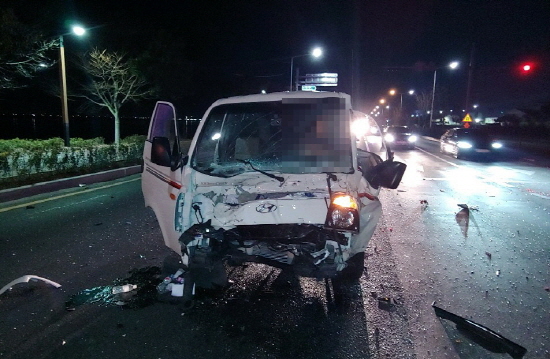 12일 0시 35분경 부산 사상구 엄궁농산물도매시장 앞 강변대로에서 50대 남성이 몰던 포터차량이 신호대기 중이던 그랜저 차량을 후미 추돌했다.