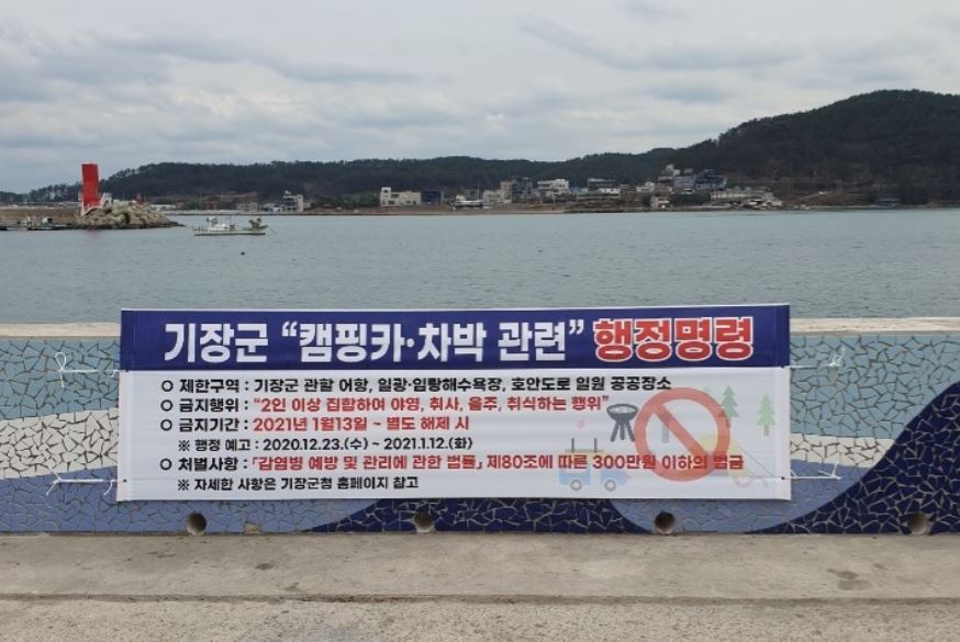 기장군은 코로나19 확산 예방 및 차단을 위해 지난해 12월 23일부터 이달 12일까지 기장군 해안가 일원에 캠핑카, 차박을 금지하는 행정예고를 하고, 13일 오후 6시부터 행정명령을 시행한다.