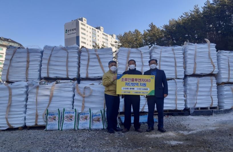 기장군은 지난 12일 기장군 동부산농협(조합장 송수호)과 농협중앙회기장지부(지부장 박현민)로부터 관내 100여 가금 사육농가 방역을 위해 생석회 1,400여포(28t)를 긴급 지원받았다.