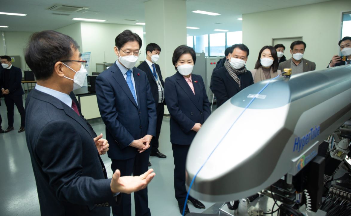 김경수 경남도지사가 하이퍼튜브(HTX: Hypertube Express) 기술개발 현장을 찾아 미래 친환경 모빌리티로서 하이퍼튜브 체계 연구개발 및 구축에 대해 논의했다.