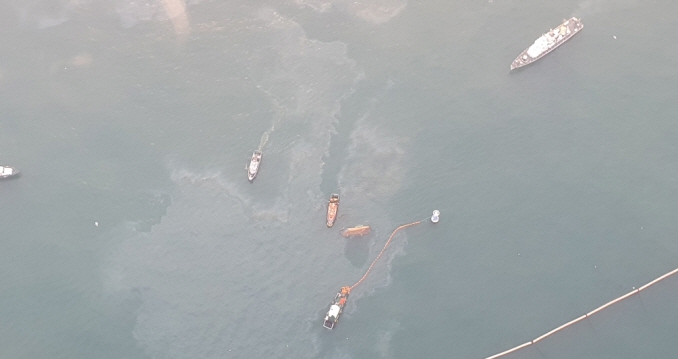 사고 여파로 남항대교와 송도 사이에 긴 곳이 800여미터에 이르는 유막이 형성돼 부산해경이 유류오염 방제작업을 벌이고 있다.