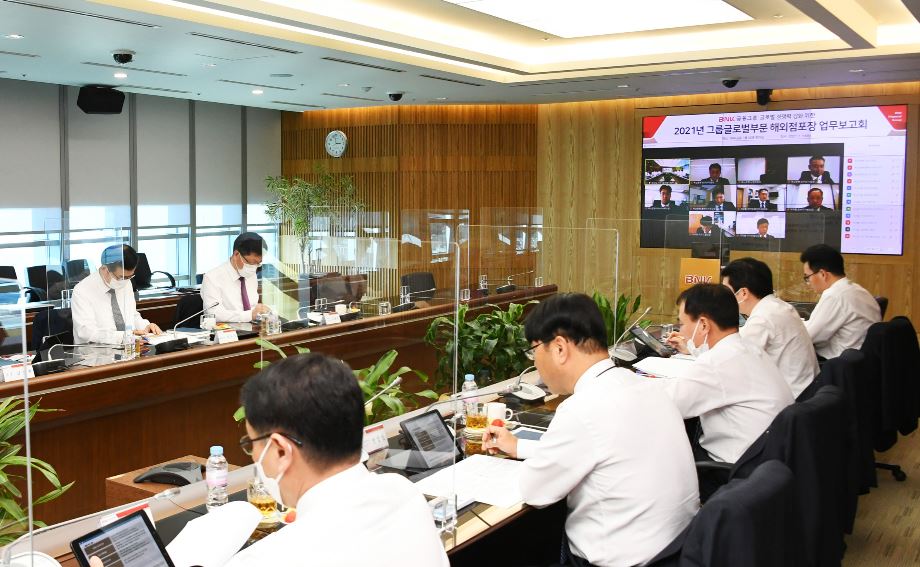 BNK금융그룹이 19일(화) 오후, BNK 본사에서 온라인 화상회의를 통해 글로벌부문 임직원 20여명과 함께 ‘2021년 그룹글로벌부문 해외점포장 업무보고회’를 진행했다.