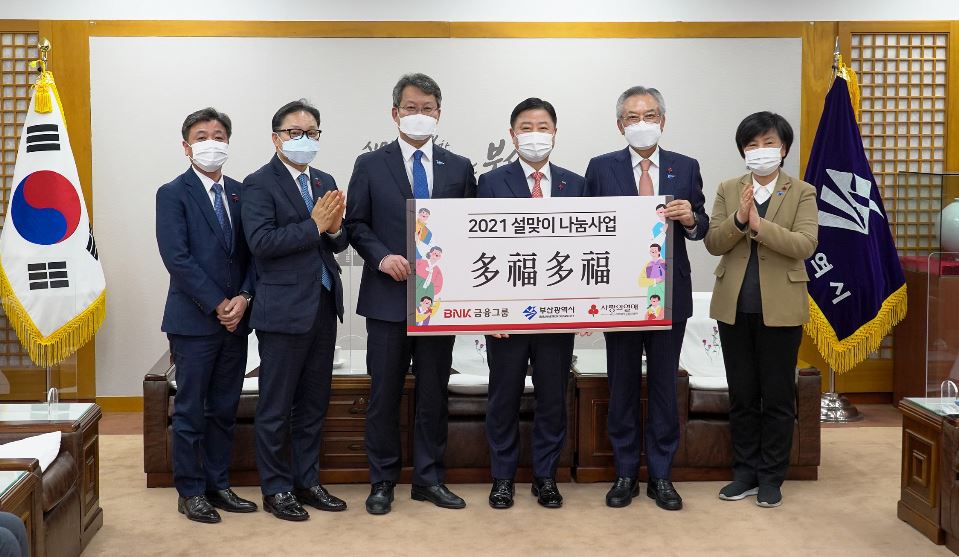 BNK금융(회장 김지완)이 19일 오후 부산시청에서 부산시, 부산사회복지공동모금회와 ‘2021 설맞이 多福多福(다복다복) 나눔 지원사업’ 전달식을 가지고 4억5000만원 상당의 ‘BNK 복꾸러미’를 기부했다.