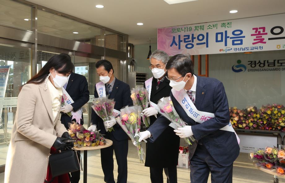 이날 행사는 박종훈 교육감을 비롯한 교육청 간부직원과 농협중앙회 경남지역본부 윤해진 본부장, NH농협은행 경남영업본부 최영식 본부장, 부경원예농협 최성환 조합장 등이 참석해 출근하는 경남교육청 직원들에게 장미, 스토크 등 1,200송이를 나눠주고, 꽃바구니 20개를 경남교육청에 전달하며 꽃 생활화 등 화훼 소비 촉진해 줄 것을 당부했다.