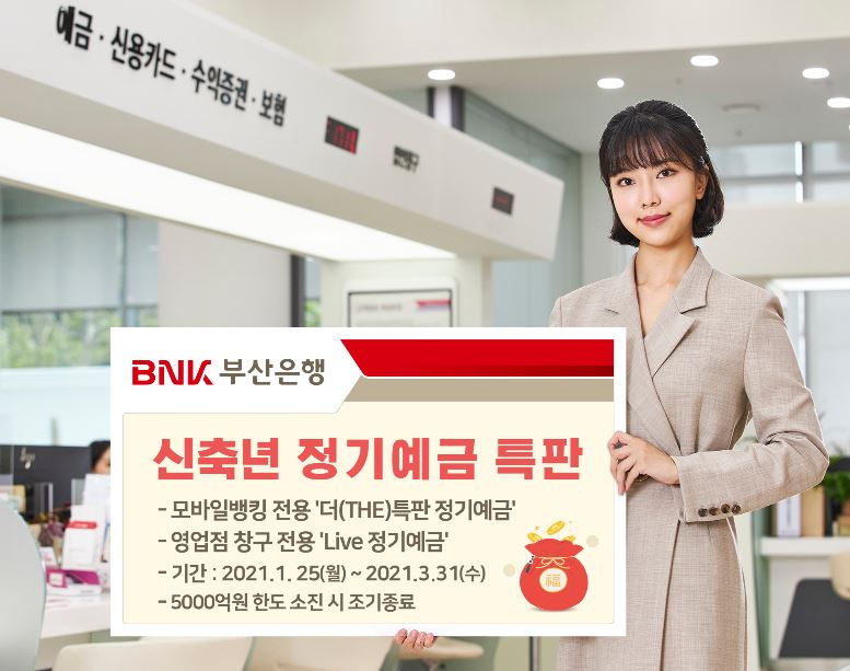 개인 및 법인 고객을 대상으로 ‘Live 정기예금’도 1월 25일부터 판매한다. 가입한도는 1000만원 이상이며, 부산은행 영업점 창구에서 가입이 가능하다.