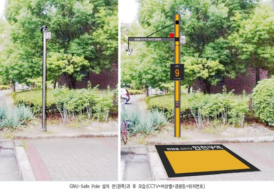 CCTV·비상벨·경광등·위치번호를 통합한 ‘GNU 세이프 폴(GNU-safe Pole)’ 설치 전(왼쪽)과 후 모습.