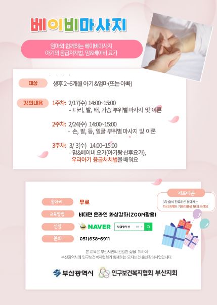 코로나19 확산 예방을 위해 2월 진행은 온라인 강좌(Zoom) 프로그램으로 먼저, 엄마(아빠)와 아이가 함께하는 베이비마사지, 신체발달 놀이로 먼저 문을 연다.