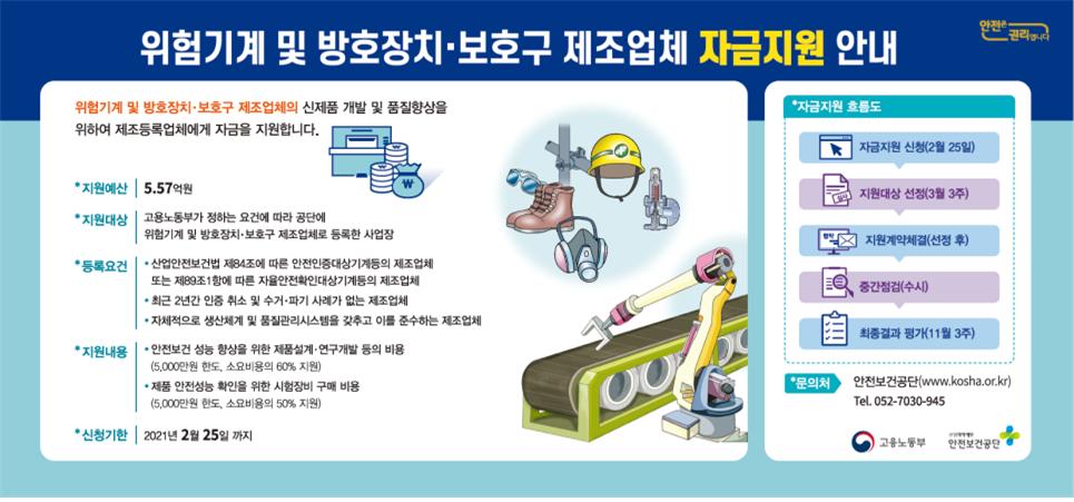 연구개발자금(소요비용의 60%이내)과 시험장비구매자금(소요비용의 50% 이내)을 각각 최대 5천만 원까지 지원하며, 지원대상은 유해·위험기계 및 방호장치·보호구 제조업체로 등록한 업체다.