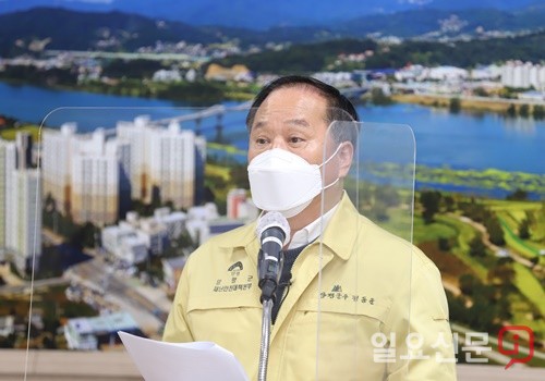 정동균 양평군수가 2일 오후 기자회견을 통해 ‘선별적 재난지원금 지원’ 대책을 발표하고 있다.
