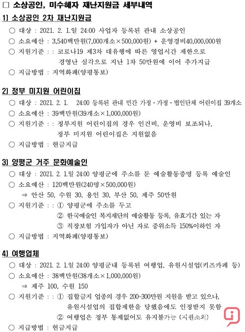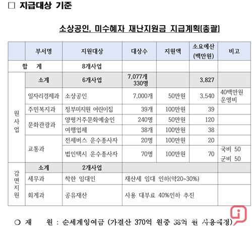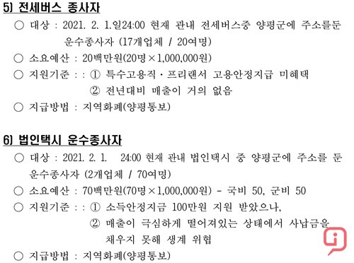 마지막으로 ▲법인택시 운수종사자에 대한 지원으로 관내법인택시 운수종사자 2개 업체 종사자 70명에게 각 100만원 씩, 총 7천만원을 양평통보로 지급할 계획이다.