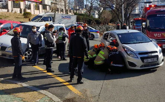 2일 오후 3시경 부산 해운대구 한 아파트 앞 도로에서 60대 보행자 A씨가 해당 아파트 단지를 나오던 스파크 차량에 부딪혔다.