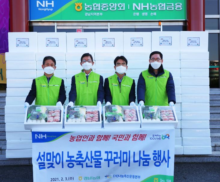 경남농협(본부장 윤해진)과 (사)나눔축산운동본부 경남도지부(지부장 권학윤/양산기장축협 조합장)는 3일 경남농협 정문에서 설을 앞두고 다문화가정을 돕기 위한 농축산물 꾸러미 나눔 행사를 가졌다.