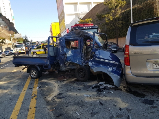 3일 오전 8시 30분경 부산 사하구 감천동 한 도로에서 2차선을 달리던 포터 차량이 노면에 미끄러져 마주오던 대형 화물차량을 들이받았다.