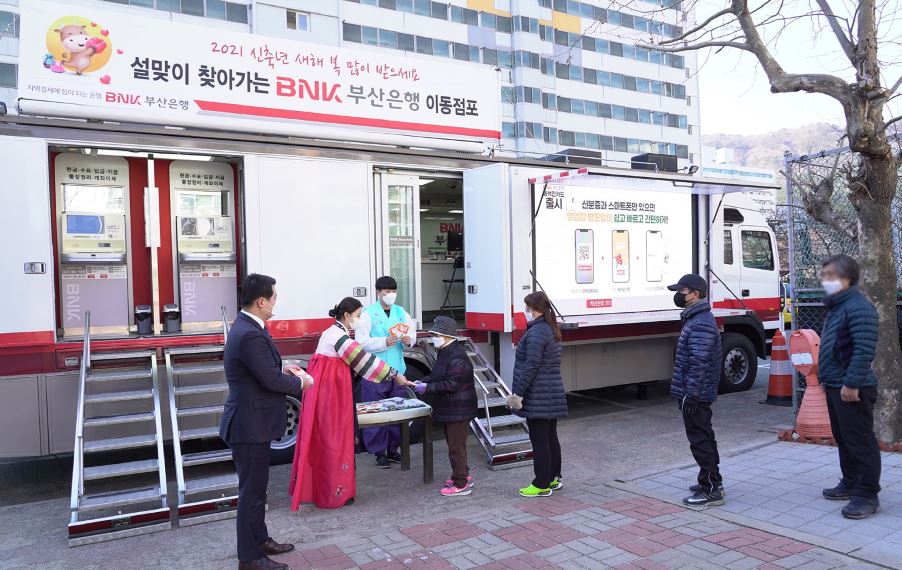 BNK부산은행은 이동점포를 통해 은행 방문이 힘든 금융소외지역의 시니어고객을 찾아가 설날 맞이 금융서비스를 실시했다.